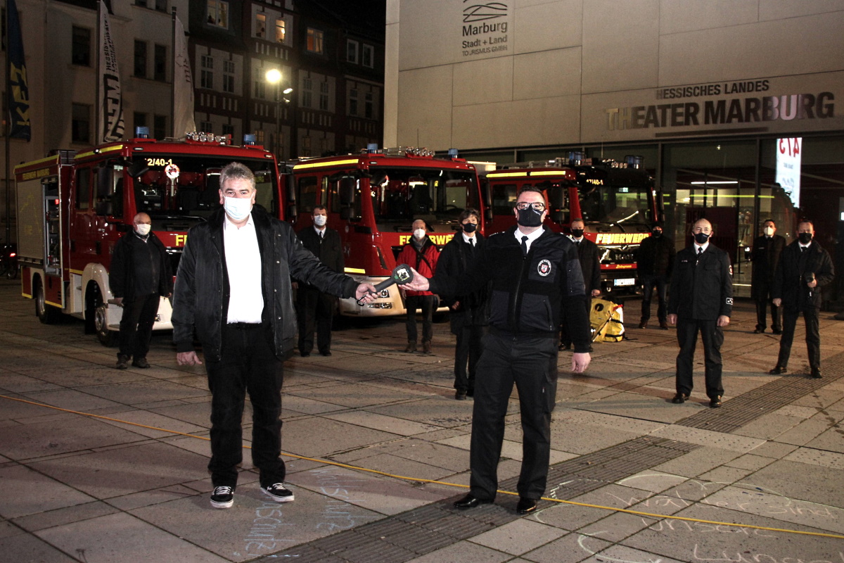 Stellvertretend für die Bürgerinnen und Bürger nahmen die Ortsvorsteher und Wehrführer von Wehrda, Michelbach und Wehrshausen die neuen Löschfahrzeuge von Wieland Stötzel vor dem Erwin-Piscator-Haus in Marburg entgegen. Die Wärmebildkameras übergab der Brandschutzdezernent in Vertretung aller Stadtteilfeuerwehren an Marc Prause, Sprecher der ehrenamtlichen Einsatzkräfte der Marburger Feuerwehr.